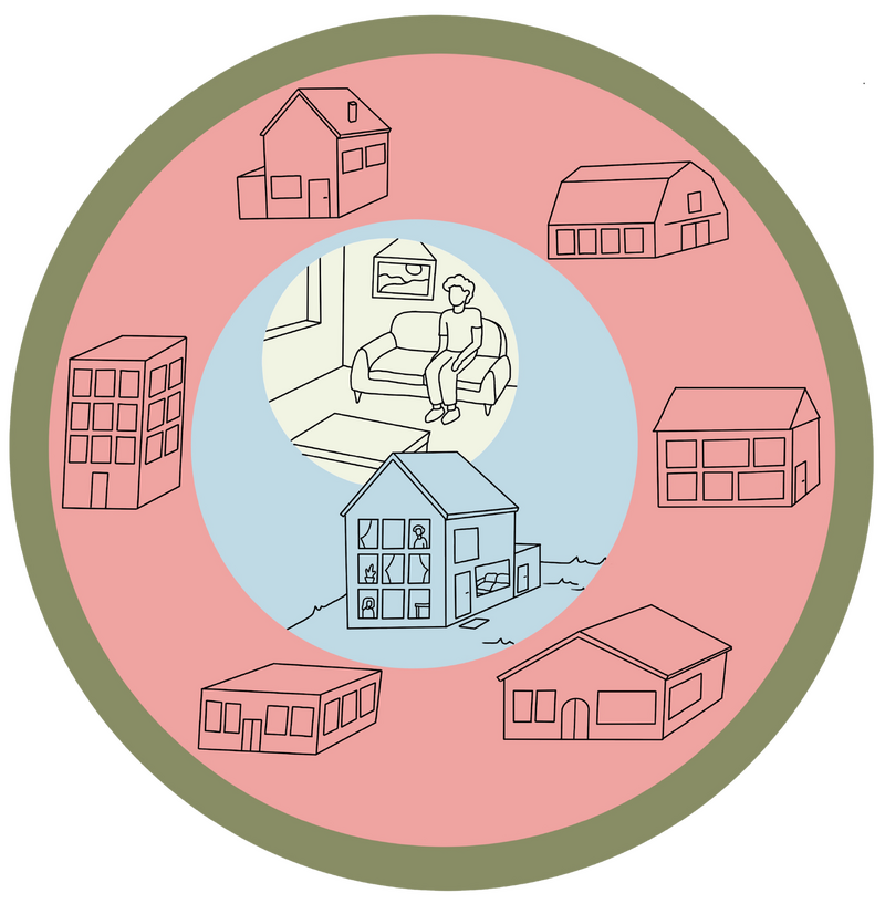 Inspraak gaat over meepraten over hoe je samen woont en/of werkt: de blauwe cirkel in het plaatje